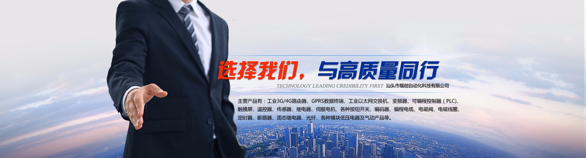 汕頭市福創(chuàng)自動(dòng)化科技有限公司是一家集自動(dòng)化元件的代理銷售與維修、自動(dòng)化設(shè)備設(shè)計(jì)制造、自動(dòng)化工程安裝改造、機(jī)電工程安裝改造、自動(dòng)化機(jī)械設(shè)備設(shè)計(jì)與制造的企業(yè)?! ≈鳡I(yíng)產(chǎn)品有:工業(yè)3G/4G路由器、GPRS數(shù)據(jù)終端、工業(yè)以太網(wǎng)交換機(jī)、變頻器、可編程控制器(PLC)、觸摸屏、溫控器、傳感器、繼電器、伺服電機(jī)、各種按鈕開(kāi)關(guān)、編碼器、編程電纜、電磁閥、電磁線圈、定時(shí)器、斷路器、固態(tài)繼電器、光纖、各種模塊低壓電器及氣動(dòng)產(chǎn)品等。